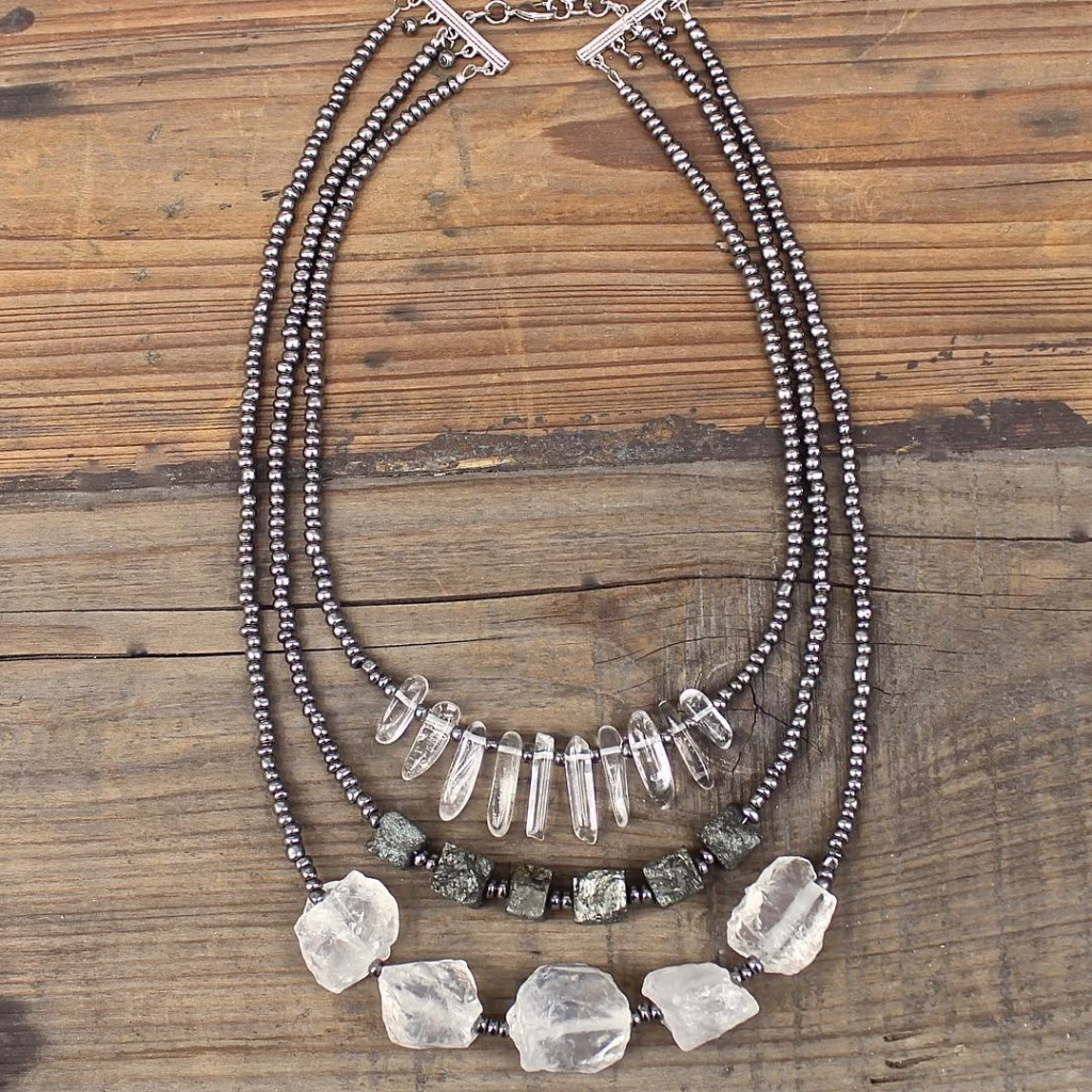 I am obsessed with the dramatic contrast between those dark, moody beads and the chunky, raw clear quartz pieces.