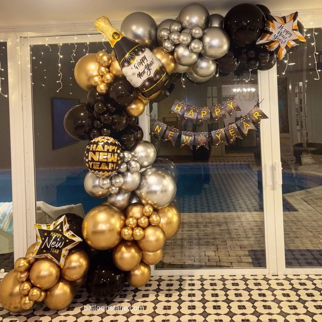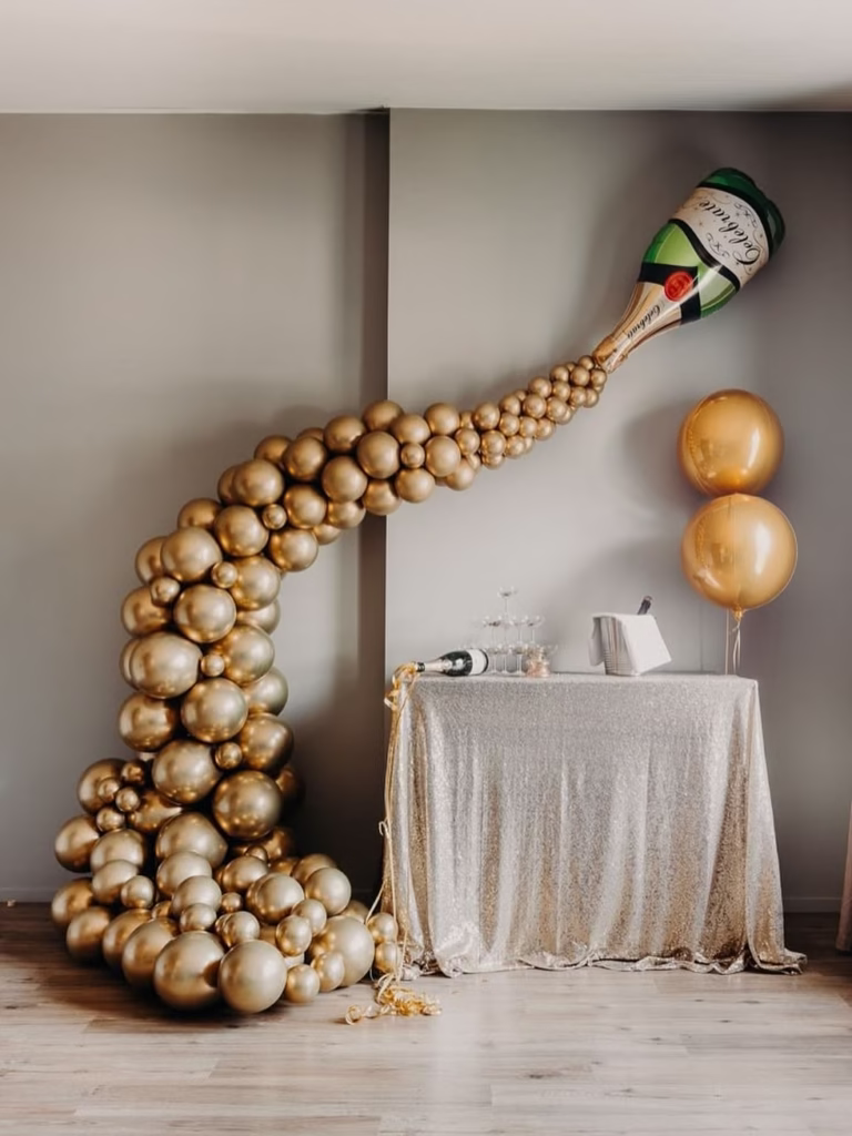 The way that balloon art is shaped like a bottle exploding with gold bubbles?