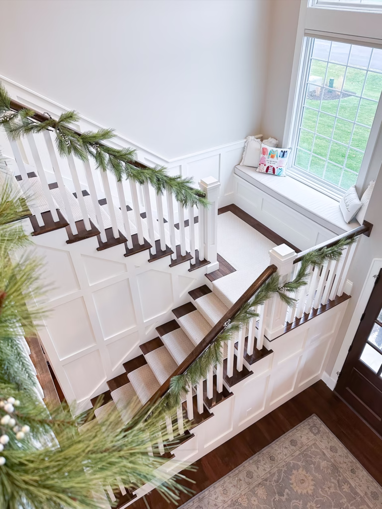 The crisp white paneling and dark wood stairs are the perfect backdrop for this simple elegance.