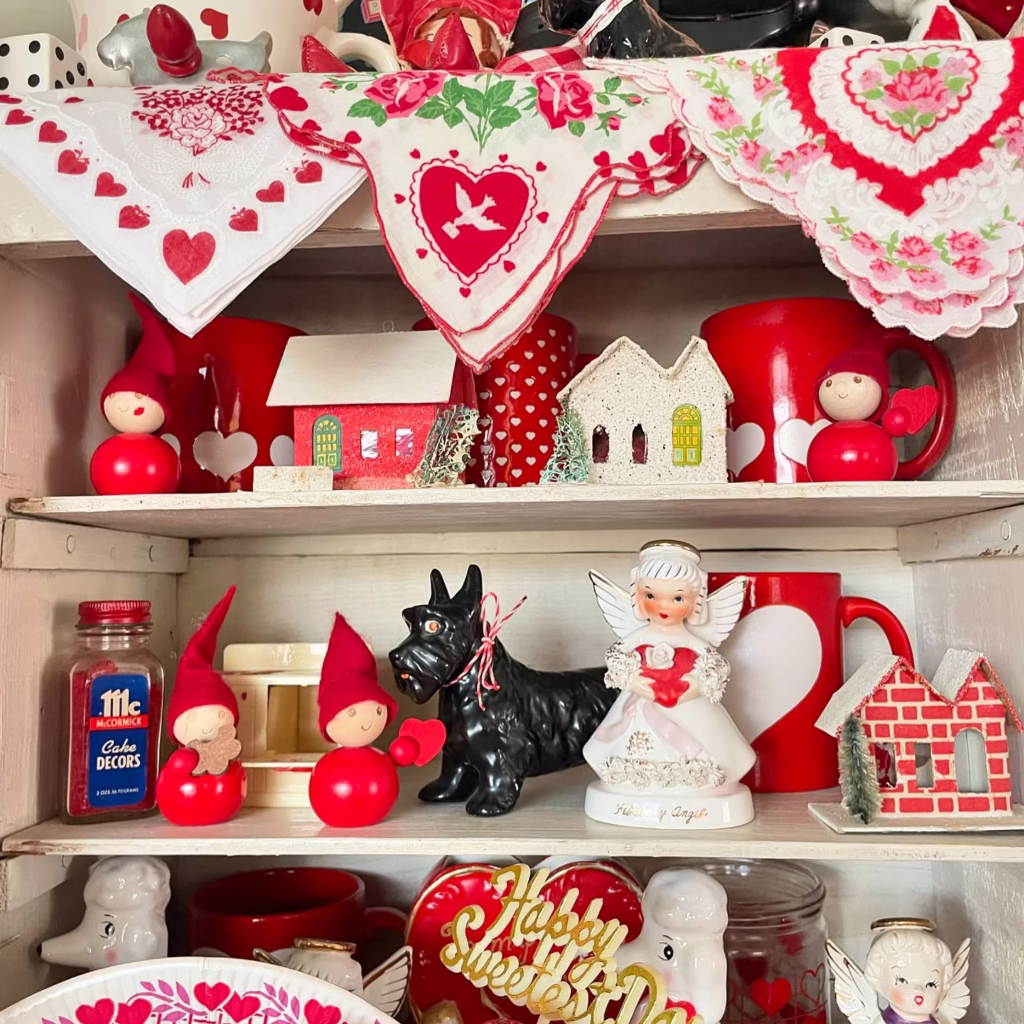 You can layer delicate lace handkerchiefs and retro ceramic figurines to build a charming, storybook display.