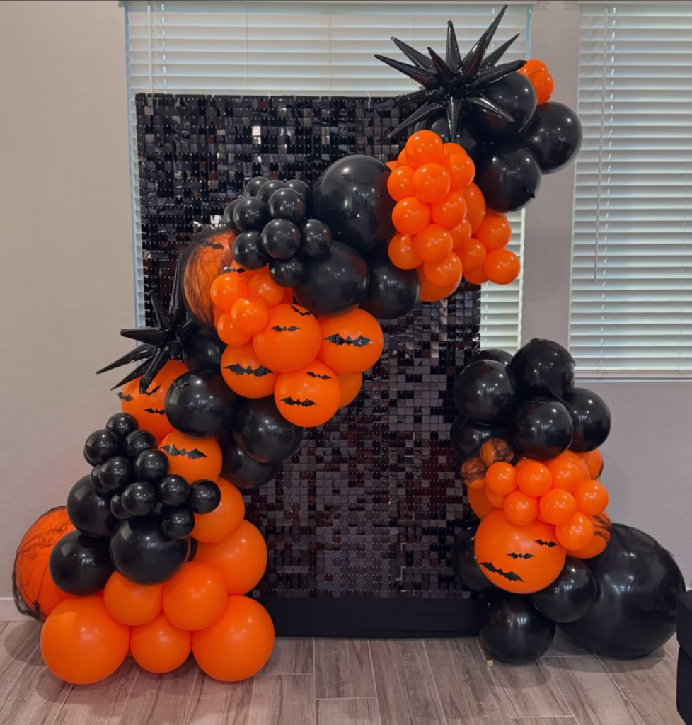 The striking orange and black balloon garland with those clever little bat faces is perfectly festive, especially with the spiky starburst details.
