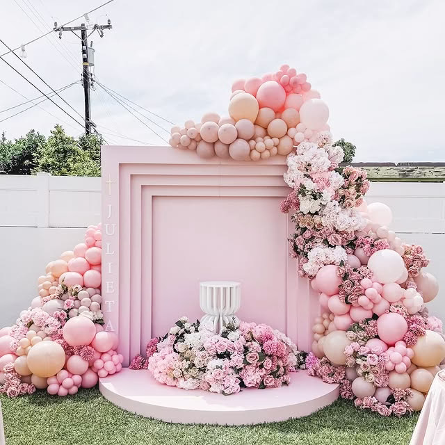 The exquisite cascade of pink roses and blush toned balloons spills gorgeously across the pedestal, softening the sharp edges.