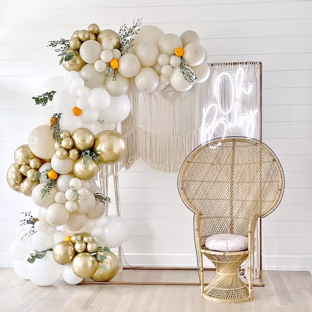 You have a beautiful neutral color palette featuring creamy whites and glamorous metallic gold balloons.