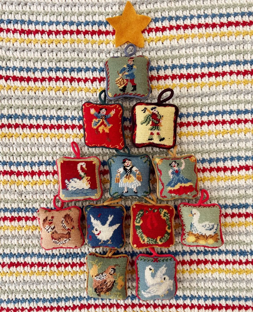 Each little pillow tells a part of the Twelve Days of Christmas story.