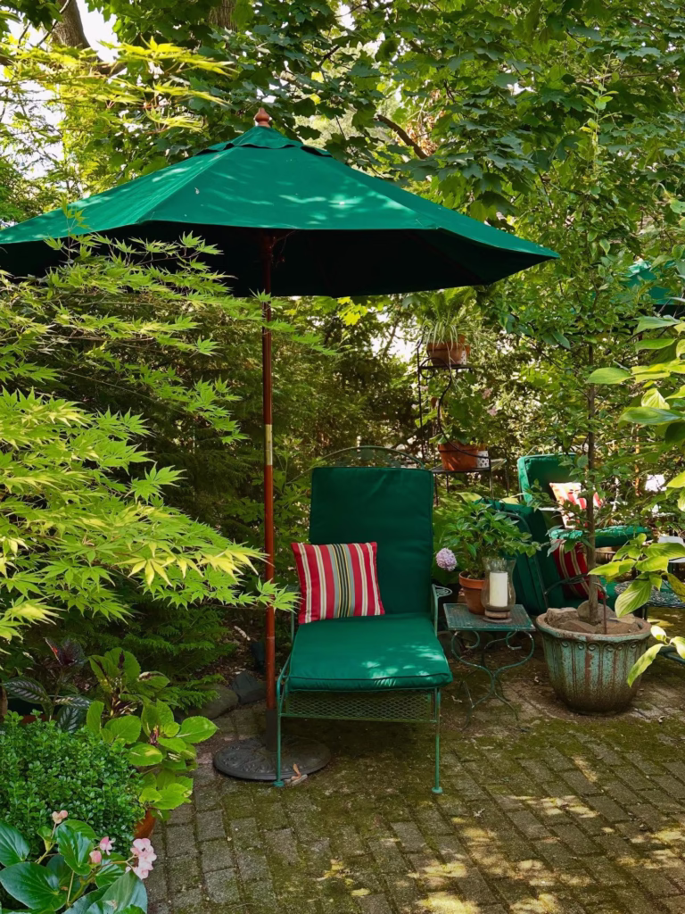 Imagine yourself unwinding in this delightful hidden nook surrounded by vibrant greenery.
