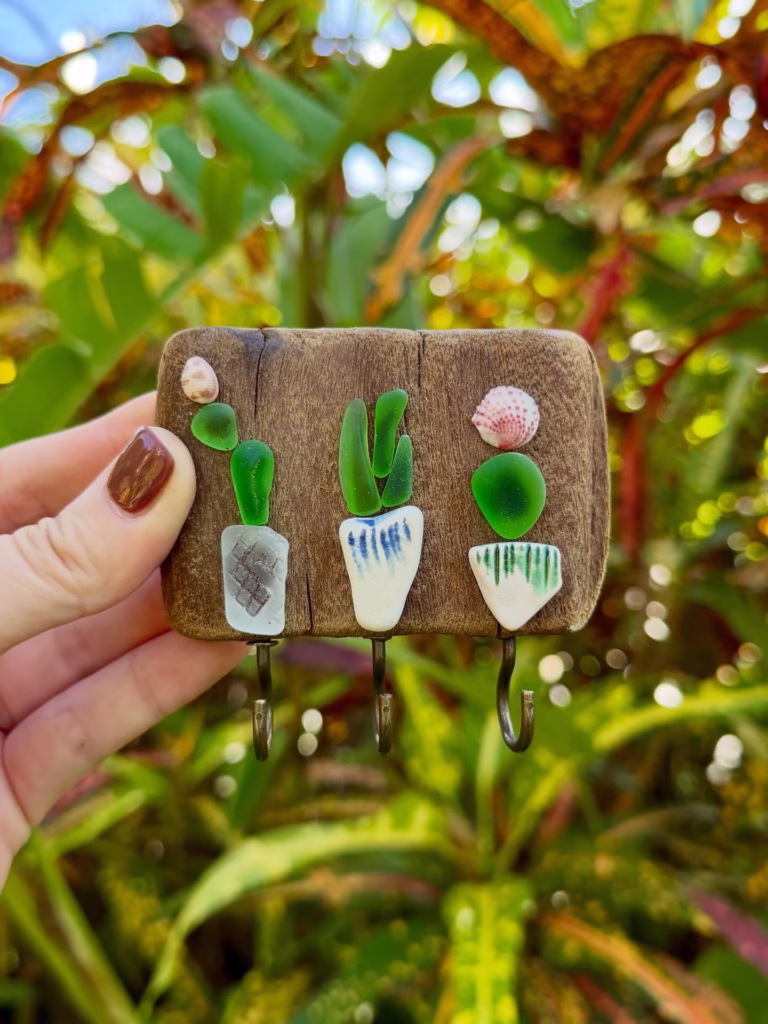 This tiny key rack is one of the most clever ways I have ever seen sea glass used in a craft.