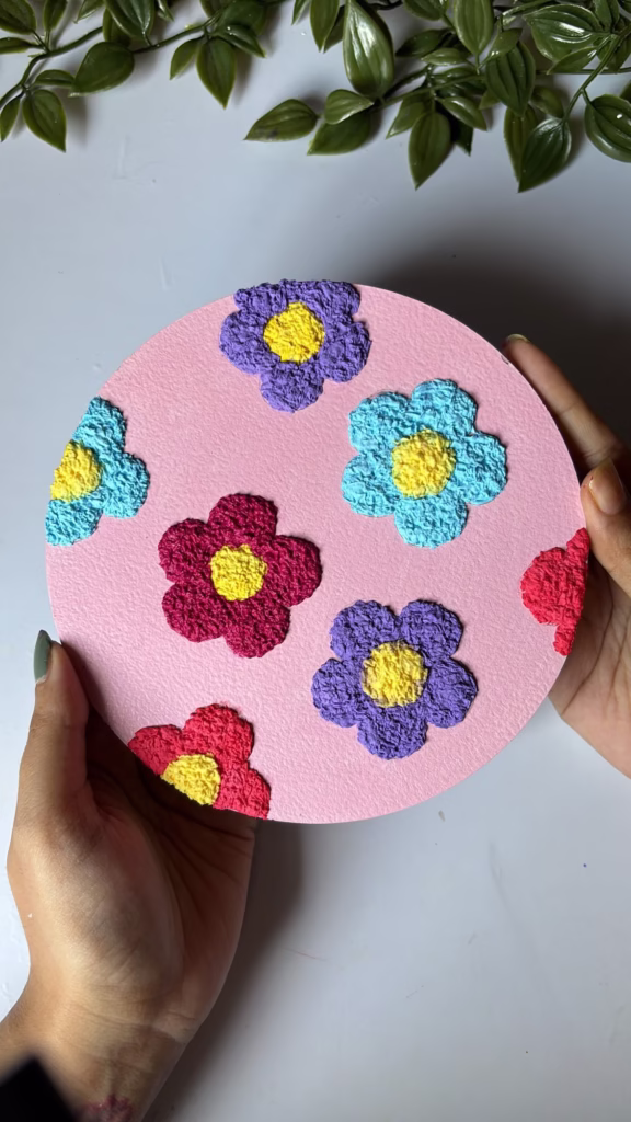 I made the letter ‘L’ for my living room, and the soft, fluffy texture of the tissue pom-poms looks amazing on the wall.
